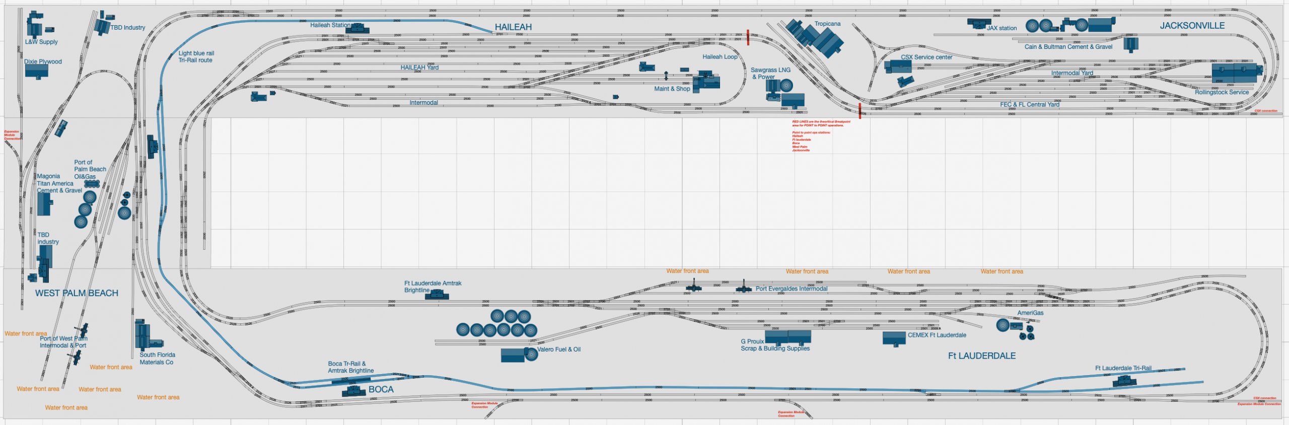 In 2018 work began on north layout. A plan had been drawn up by club members and given to the n scalers to make it a reality. One of the biggest requests was to model Florida and to make sure the curved portions of the layout could handle large engines that required large radius curves along with locomotive facilities with the possibility of connecting the two layouts down the road. Since we will be running both diesel and steam locomotives, the engine facility is quite large enough to handle both kinds of motive power. This layout would be set up for DCC operation, however because we are using Digitrax, it is possible to run DC equipment but is not suggested. It tends to be rough on DC equipped locomotives. Below are several pictures of the start of the new layout.